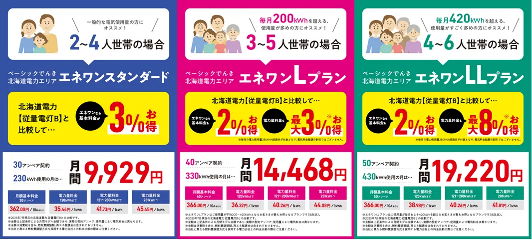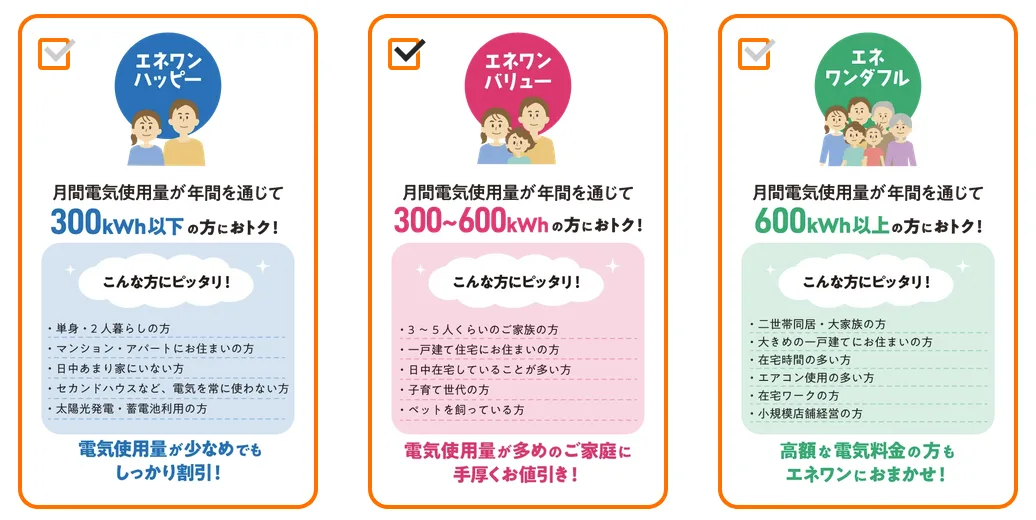• 一人暮らし向けから大家族向けまで幅広く対応。300kWh以上の使用世帯に特におすすめ。