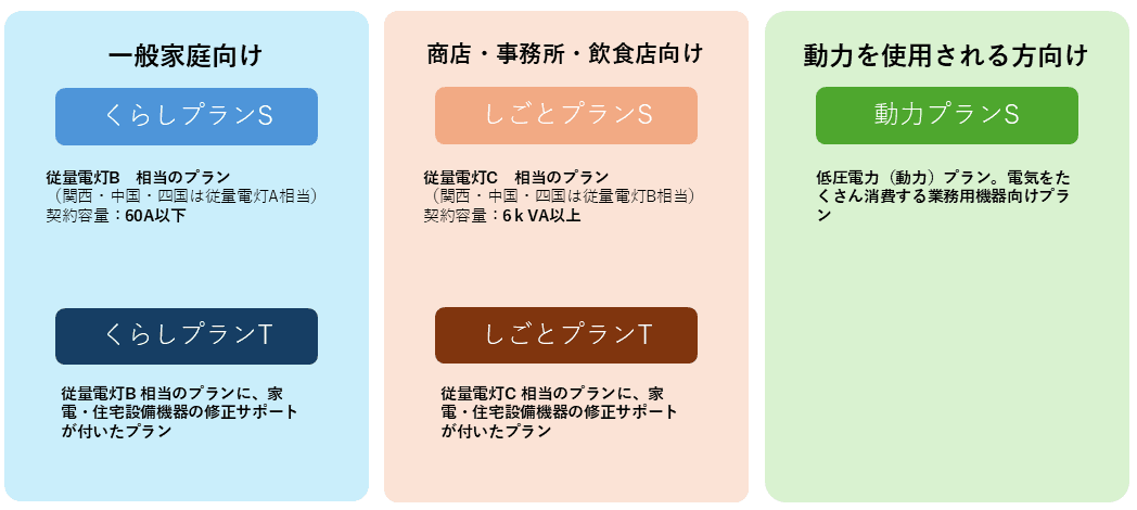 オール電化向けプランや、時間帯別に料金単価が変わるプラン、再生可能エネルギー由来のプラン、ガスや他のサービスとセットになっているプランなどは一切ありません。